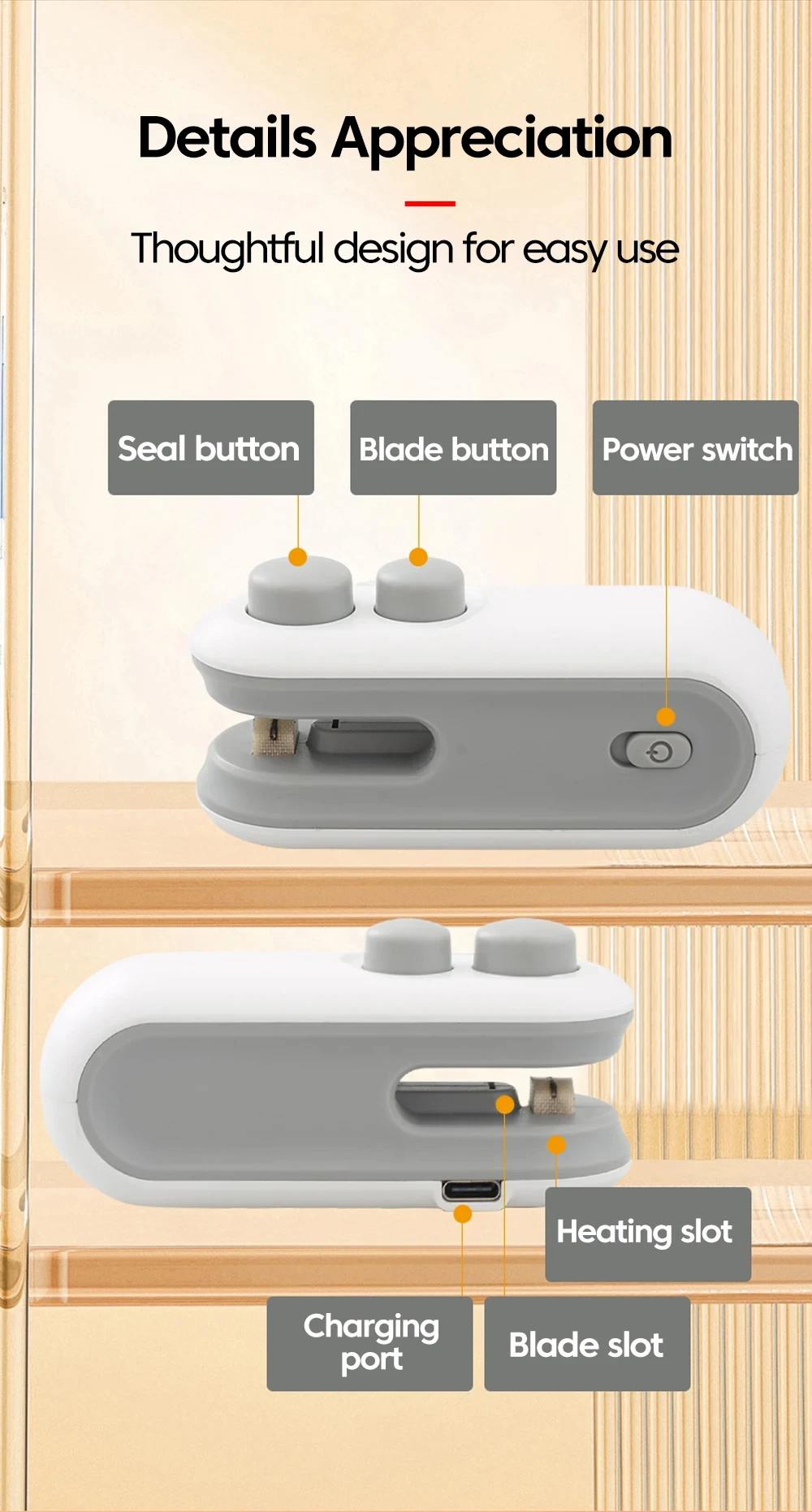 1. Equipped with a high-capacity battery, this mini sealer can be recharged via USB, ensuring convenience on-the-go.